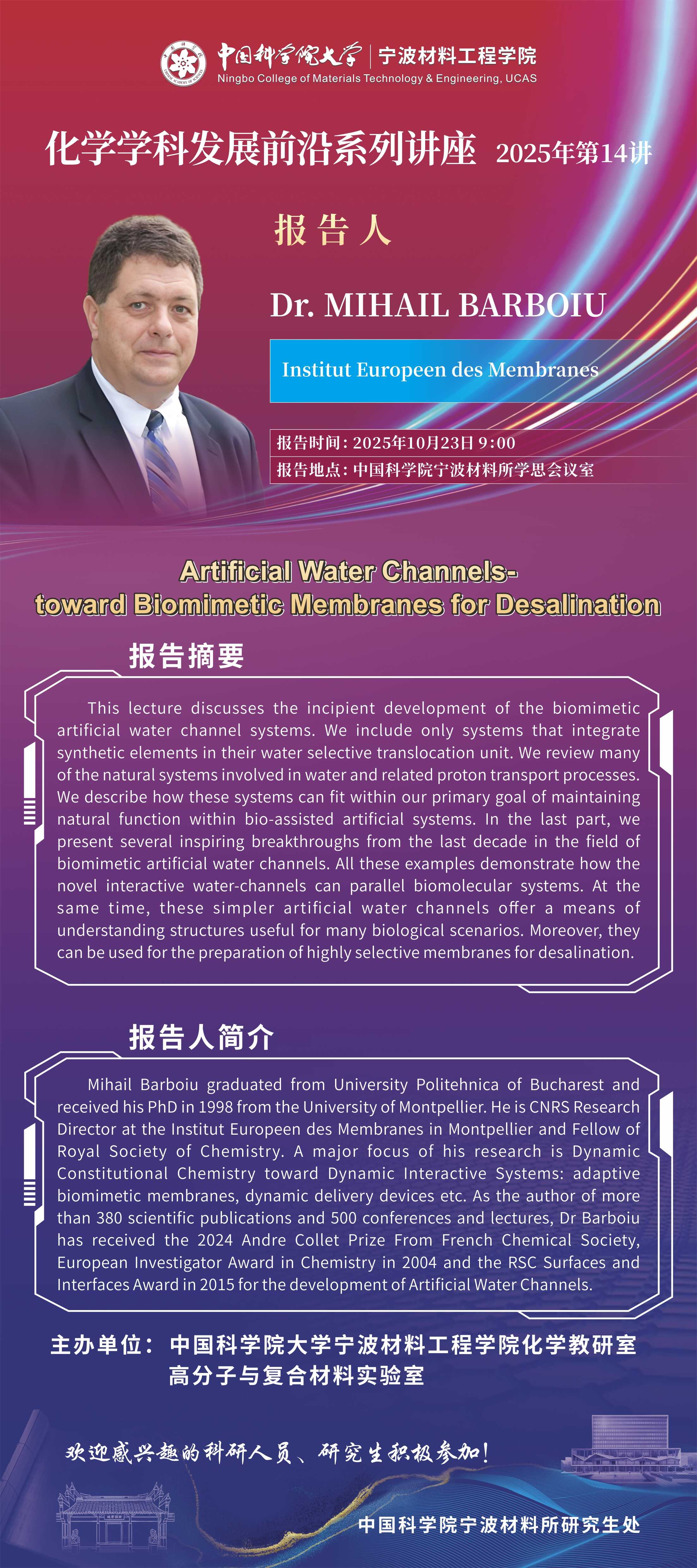 10月23日:MIHAIL BARBOIU:Artificial Water Channels- toward Biomimetic Membranes for Desalination