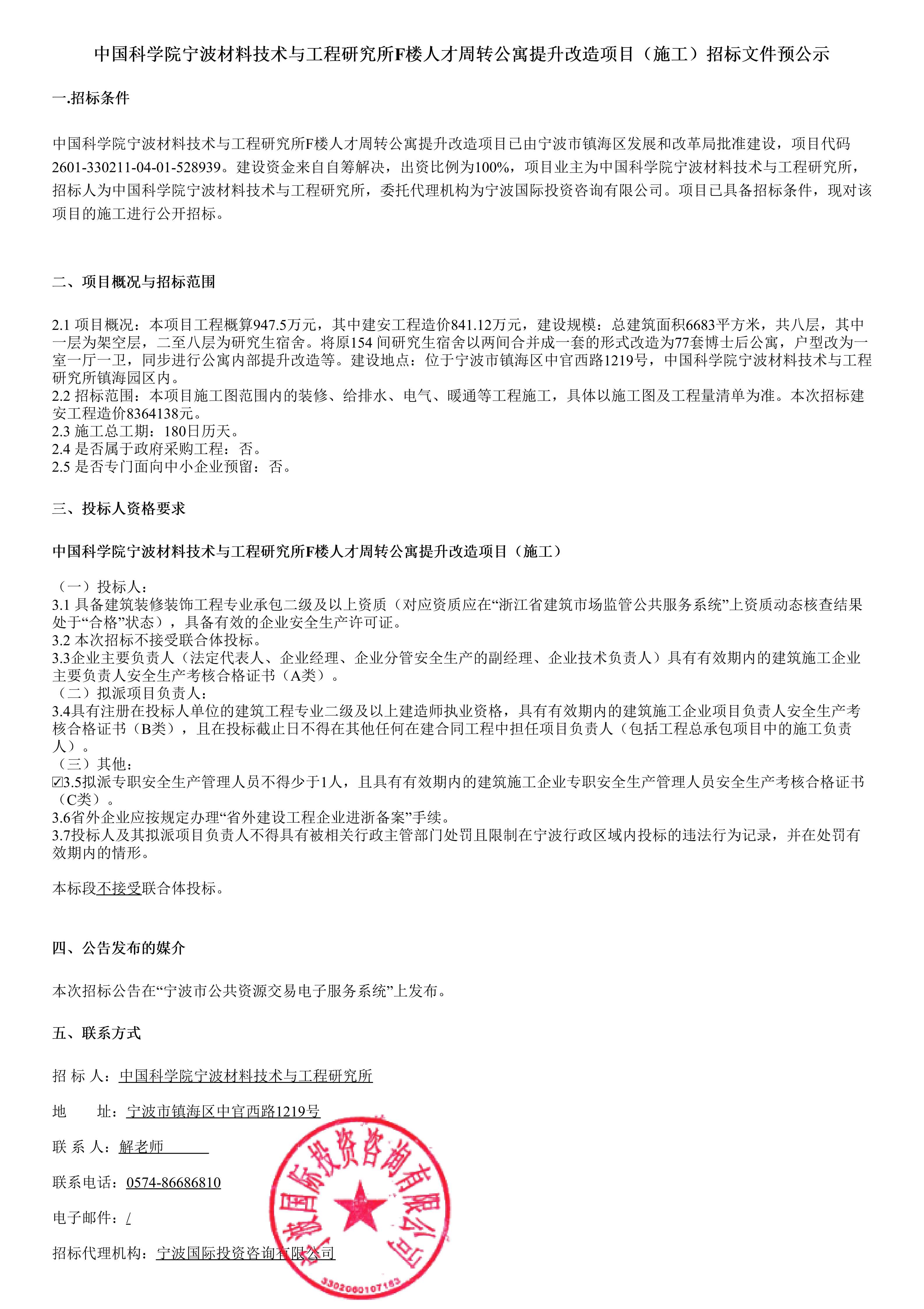 中国科学院宁波材料技术与工程研究所F楼人才周转公寓提升改造项目(施工)招标文件预公示