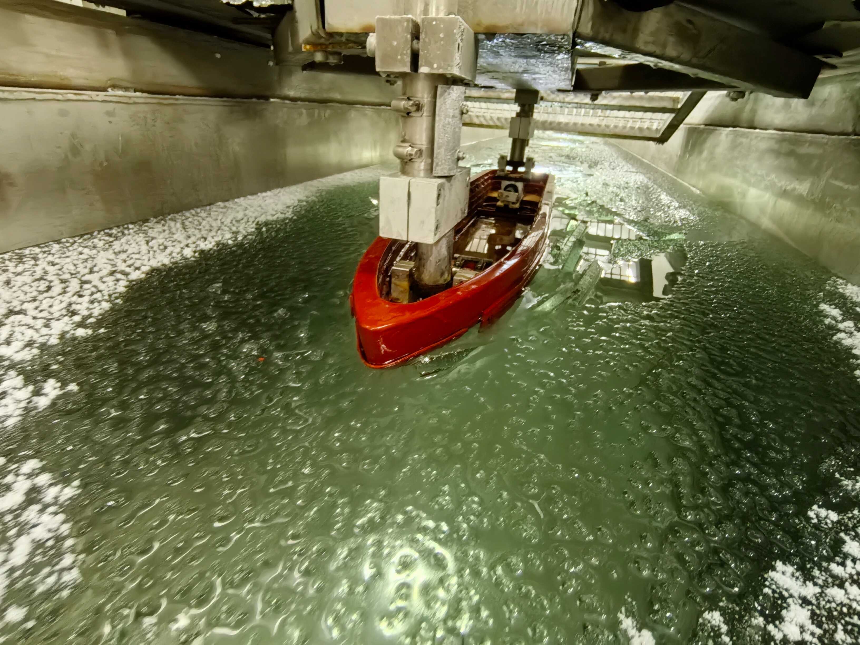 走进冰力冲击实验舱,一股冷气直扑全身,头顶飘着雪花,冰水池内是一层厚厚的冰,一艘船模型已经起航,正开展破冰实验。