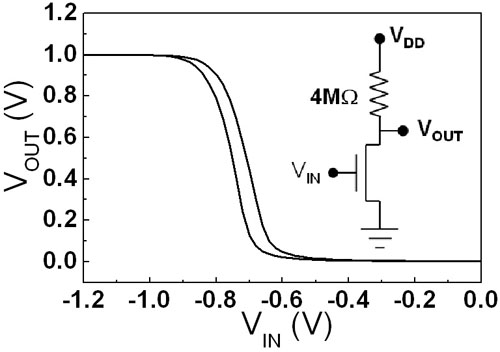 近期,宁波材料所科研人员结合全固态离子液电解质独特的离子/电子界面双电层耦合特性,制作了具有侧向耦合结构的氧化物薄膜晶体管,栅电极对沟道导电特性的调控通过侧向耦合的方式实现。测试表明,侧向耦合的双电层电容高达~2μF/cm2。对晶体管性能进行测试,发现器件在1.5V工作电压下的开关比高达106以上,电子迁移率高达24cm2/Vs,亚阈值斜率仅为~90mV/dec。将器件与适当阻值的电阻相连,获得了电阻负载型反相器,在Vdd=1V时的反相器电压增益高达~8。与此同时,分析了器件的瞬态响应特性,获得了质子弛豫的特征时间常数。这种晶体管在低功耗、便携式器件领域有着潜在应用价值。相关成果发表于ACS Applied Materials & Interface(2015), Applied Physics Letters105(2014)243508等杂志上。