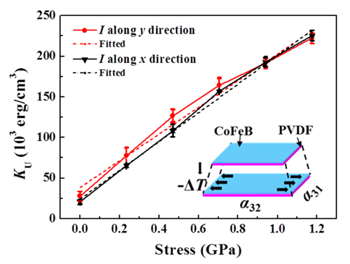 聚偏氟乙烯(PVDF)是一种具有各向异性热膨胀特性的柔性材料。研究人员将非晶CoFeB磁性薄膜生长在PVDF衬底上,巧妙利用PVDF衬底表现出的各向异性热膨胀特性,对薄膜施加连续变化的单轴应力。通过测量不同应力状态下磁性材料的各向异性磁电阻,并拟合不同磁场、不同应力状态下的各向异性磁电阻曲线,我们首次确定非晶CoFeB薄膜磁弹各向异性的应力系数为1.7*