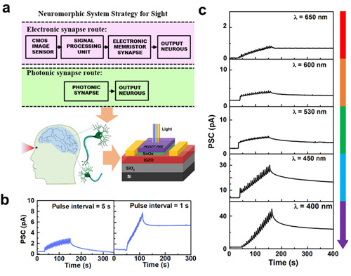 图2 光敏神经突触器件用于视觉模拟的示意性方案及耦合器件在长程、短程可塑性和宽光谱响应方面的性能展示