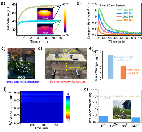 图4 a-b) POG的光热蒸发性能;c-g) 基于POG获得纯净水的户外实验