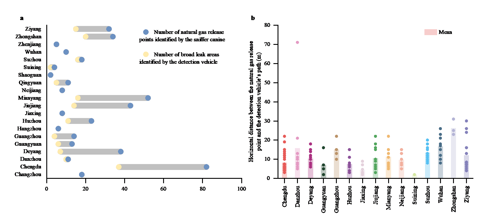 中国科学院宁波材料技术与工程研究所海洋关键材料全国重点实验室海洋能源材料与装备服役安全团队在程玉峰院士带领下,与港华投资有限公司项亚琴团队合作,创新性地将车载激光检测系统与训练有素的嗅探犬相结合,开发出高效精准的光学-生物协同型新技术,在城市燃气泄漏检测方面取得突破性进展。目前,该技术已在全国20个城市约4000公里燃气管网系统中得到成功应用。结果表明,在车载系统识别的220个泄漏区域内,嗅探犬精确定位了432个天然气释放点。该技术最远可探测距离车辆行驶路线71米的天然气泄漏点,显著优于传统方法(如图1)。这项研究不仅为城市燃气管网安全管理提供了创新型技术,也为光学-生物协同检测在其他领域的应用提供了新思路。研究团队正进一步优化技术,根据不同城市环境条件的应用效果,探索该技术和其他市政安全与环境监测系统的集成。
