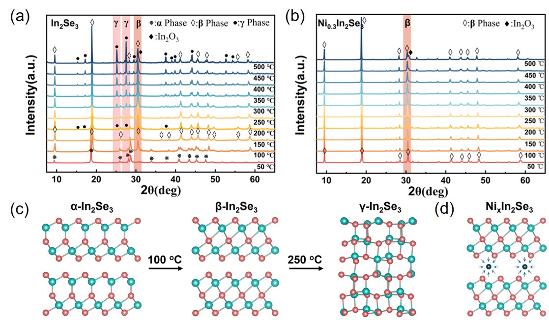 图2 Ni插层对In2Se3相稳定性的影响:(a-b)原位XRD揭示In2Se3和Ni0.3In2Se3在50-500℃温度范围内的相结构变化;(c-d)In2Se3和Ni0.3In2Se3不同的相转变行为示意图