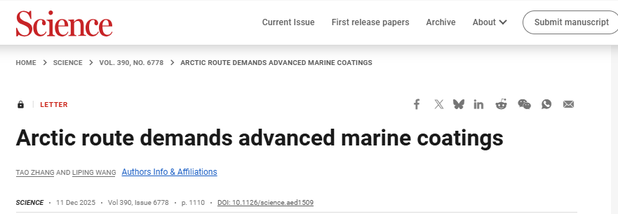 该文章由宁波材料所张涛研究员和王立平研究员共同署名完成。文章信息:Tao Zhang, Liping Wang, Arctic route demands advanced marine coatings, Science, 2025, 389 (6763): aed1509 https://doi.org/10.1126/science.aed1509