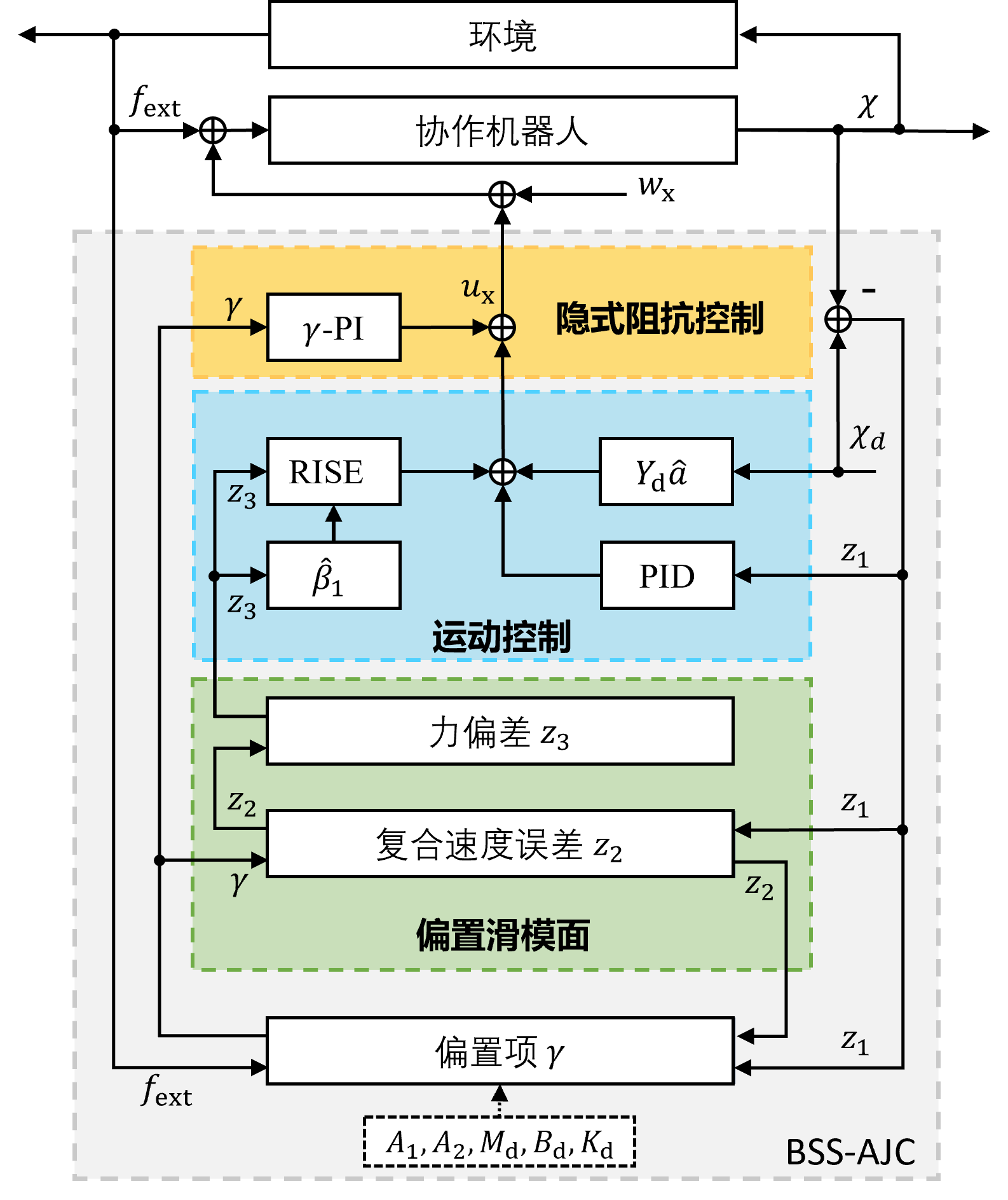 针对这一挑战,中国科学院宁波材料技术与工程研究所精密驱动与智能机器人技术团队与英国利物浦大学杨辰光教授团队合作提出了一种基于偏置滑模面(Biased Sliding Surface, BSS)的协作机器人自适应跃度控制(AJC)(图1),有效解决了低阻尼阻抗渲染需求下的控制稳定性难题。该方法首先通过接触力反馈和复合运动误差,实时表征力-位耦合特性的动态变化,构建了一种包含力冲量项的偏置滑模面,从而在欠阻尼的情况下也能准确估计力偏差;随后,利用鲁棒误差积分策略对系统跃度进行调节,实现了力偏差的指数衰减;在此基础上,提出了一种基于力偏差范数的增益自适应律,实时动态调整滑模增益,抑制了控制信号的抖动,并有效避免了传统方法中因速度误差与力偏差方向相反导致的系统失稳问题。