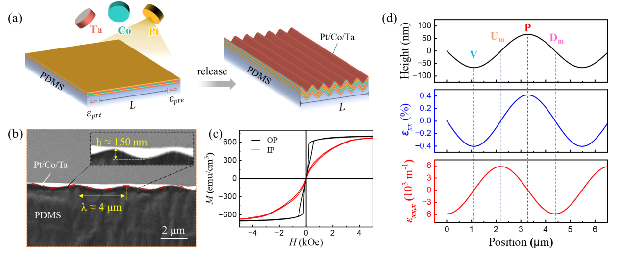 图1 褶皱Pt/Co/Ta多层膜的制备,形貌、磁性表征与应变分布