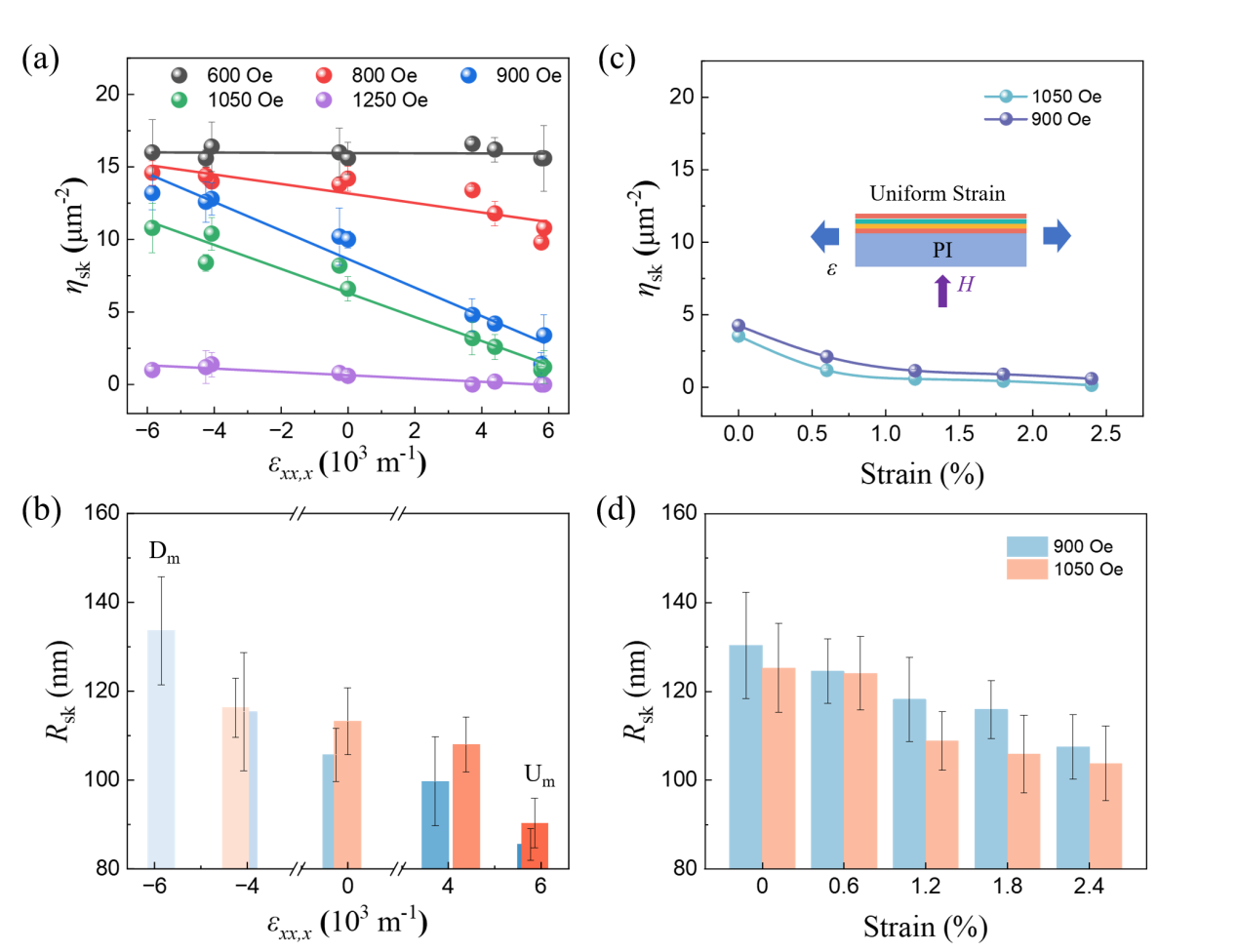 图3 磁斯格明子密度、尺寸的应变梯度调控策略与传统均匀应变调控方法对比