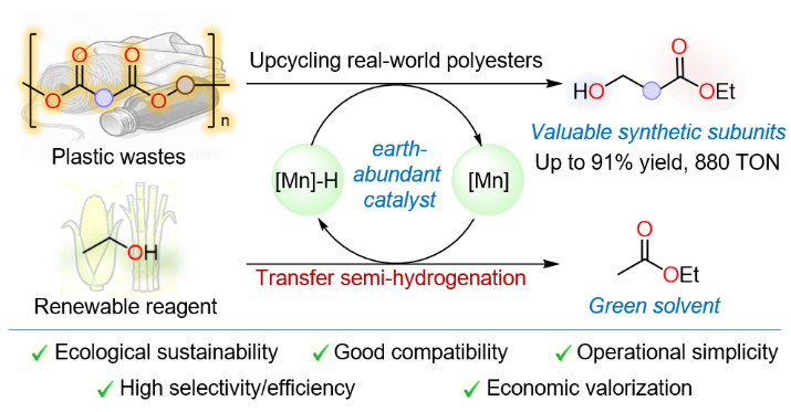 针对这一挑战,中国科学院宁波材料技术与工程研究所有机储氢与催化团队,在前期聚酯催化氢解研究的基础上(Angew. Chem. Int. Ed. 2023, 62, e202312564; Angew. Chem. Int. Ed. 2025, 64, e202502923),提出了一种以丰产金属锰为催化剂、乙醇既作为氢源又作为酯交换试剂的新策略,首次成功将包括PET在内的多种聚酯废弃物选择性地转化为含有羟甲基和酯基双官能团的高附加值化学品。