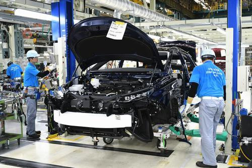 (2018年 6月29日,在日本爱知县的丰田元町工厂,两名员工将丰田氢燃料电池车MIRAI推向下一个工位。新华社记者华义摄)