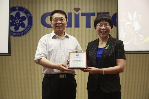 白春礼为崔平颁发荣誉牌并做了重要讲话。他充分肯定了崔平同志坚守一线领导岗位、团结带领筹建组和第一、第二届领导班子,为宁波材料所的建立和发展做出的重要贡献,并代表院党组向崔平同志表示感谢。他同时对宁波材料所十三年多的发展成就给予了高度赞赏,他表示,宁波材料所从初建到今天只有十几年的时间,但已发展成为一所国内外知名的科研机构,特别在落实“三个面向”、促进科技成果转化方面积极探索、大胆实践,已成为我院科研机构的典范。
