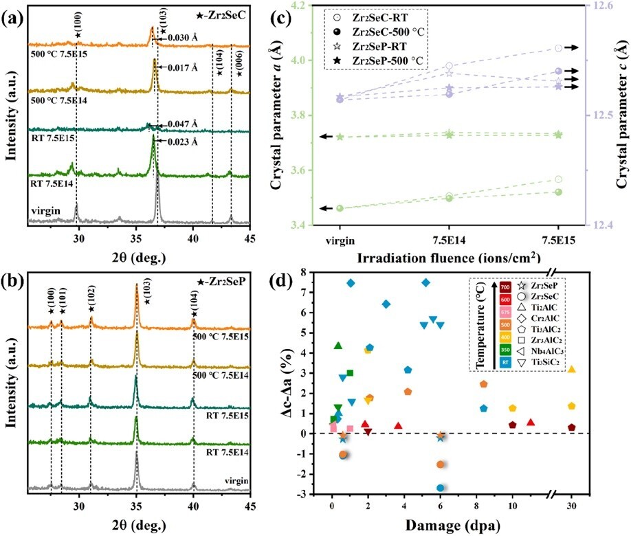近期,黄庆研究员和陈科研究员带领团队,尝试突破传统[M-A]结构亚层对辐照损伤行为的研究框架,重点关注共价型MAX相中X位元素对材料辐照行为的影响,通过对比Zr2SeC与Zr2SeP两种MAX相辐照后的晶格畸变行为,获得了一系列研究发现:在6 MeV Si+离子辐照损伤达6 dpa后,Zr2SeP晶格常数a/c值膨胀率差值仅为0.20%(室温)与0.009%(500℃),这一数值在已报道的MAX相辐照行为研究中,在迄今为止的MAX相辐照行为报道中各向异性最小。研究认为,这种独特的膨胀行为可能源于其M-A-M键角对辐照肿胀路径的重构。同时,团队初步揭示了X位元素的影响机制:一是X位电负性对MA-AM反位缺陷形成能的调节作用;二是降低辐照空位迁移能,有助于提升空位晶界迁移率。该研究首次初步阐释了X位元素对共价型MAX相抗辐照性能的重要影响,并尝试建立共价亚层编辑-键合调控-缺陷动力学重构-各向异性肿胀抑制的MAX相设计逻辑,为下一代事故容错核材料的精准编辑与定向设计提供了新的思路参考。