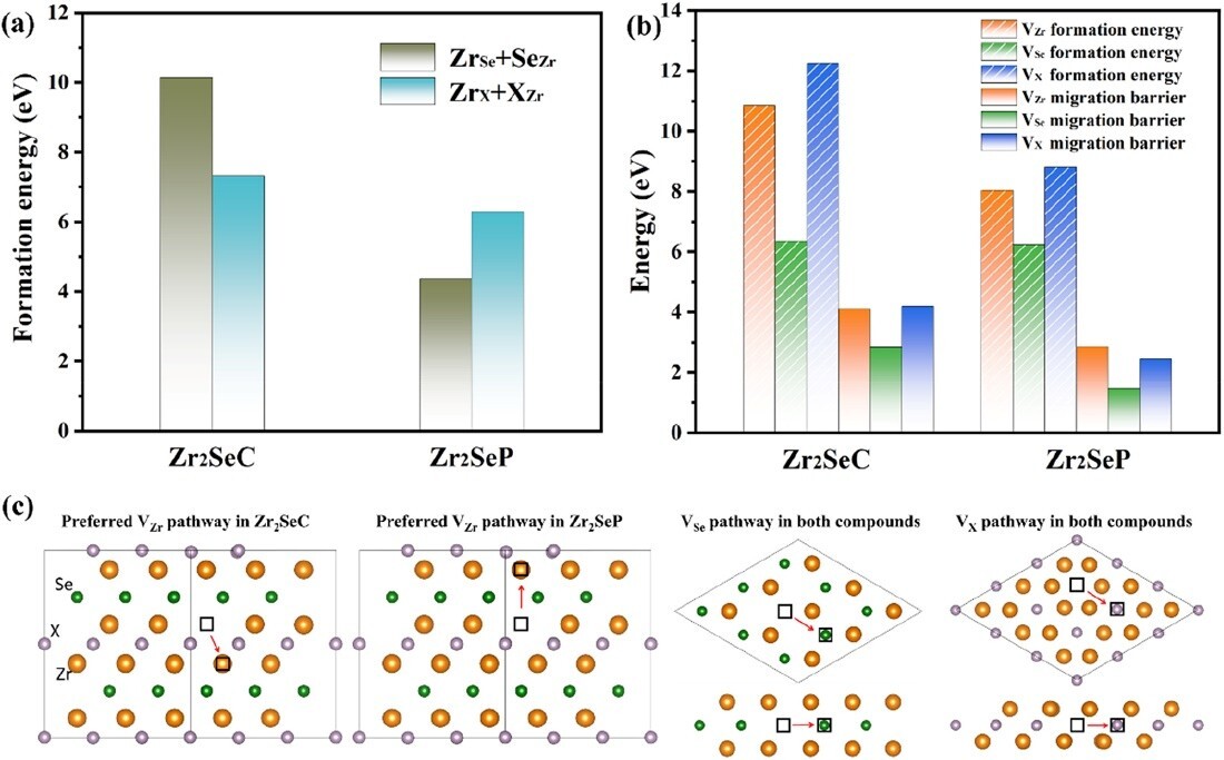 图2 Zr2SeC与Zr2SeP的辐照缺陷特征:(a)MA-AM与MX-XM反位缺陷形成能;(b)VZr、VSe、VX空位形成能与迁移能垒;(c)空位迁移路径示意图。