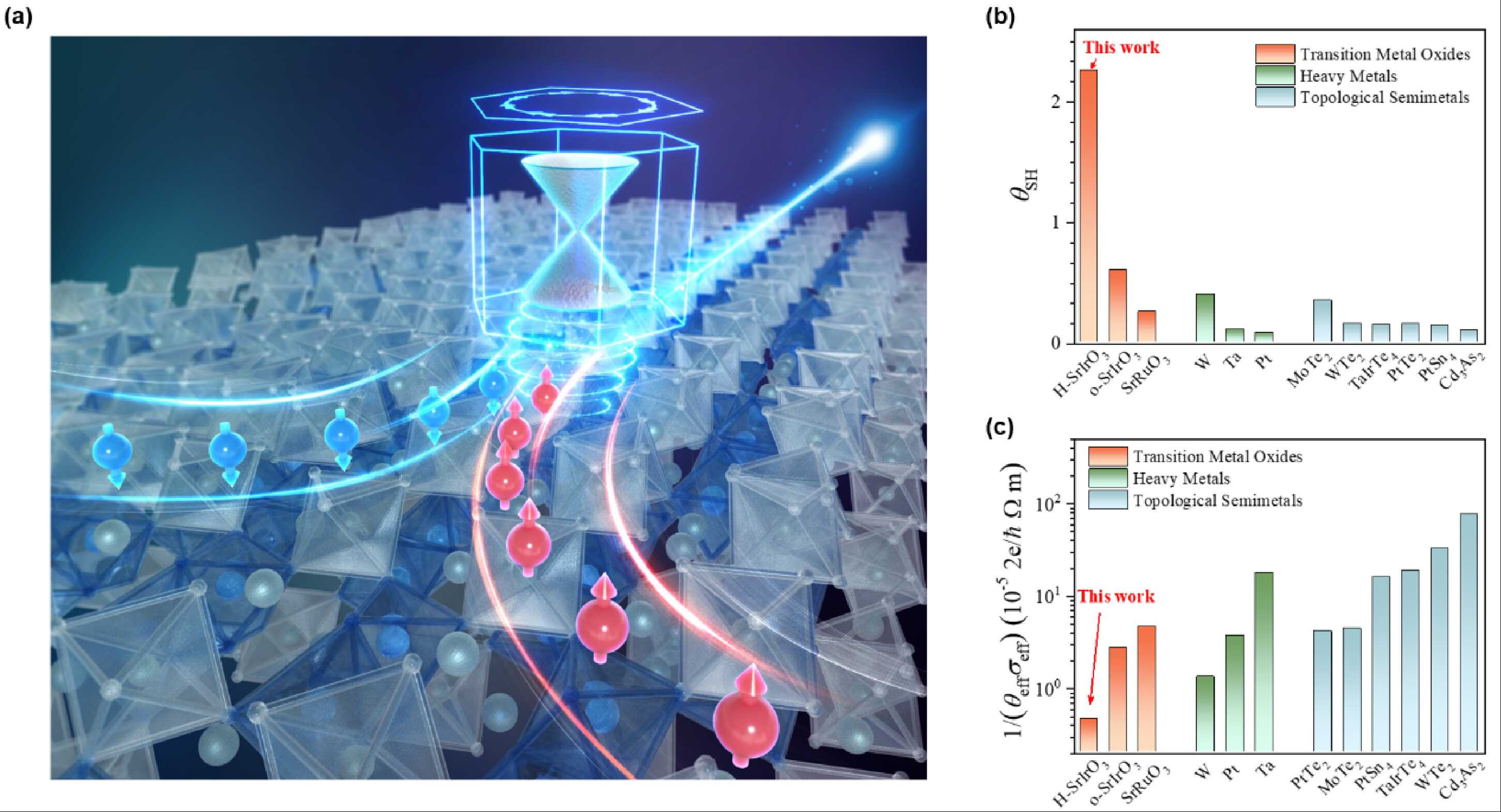 (b-c)六角SrIrO3的自旋霍尔角和功耗与其他材料的对比,展示了其在SOT效率和写入功耗方面的显著优势。